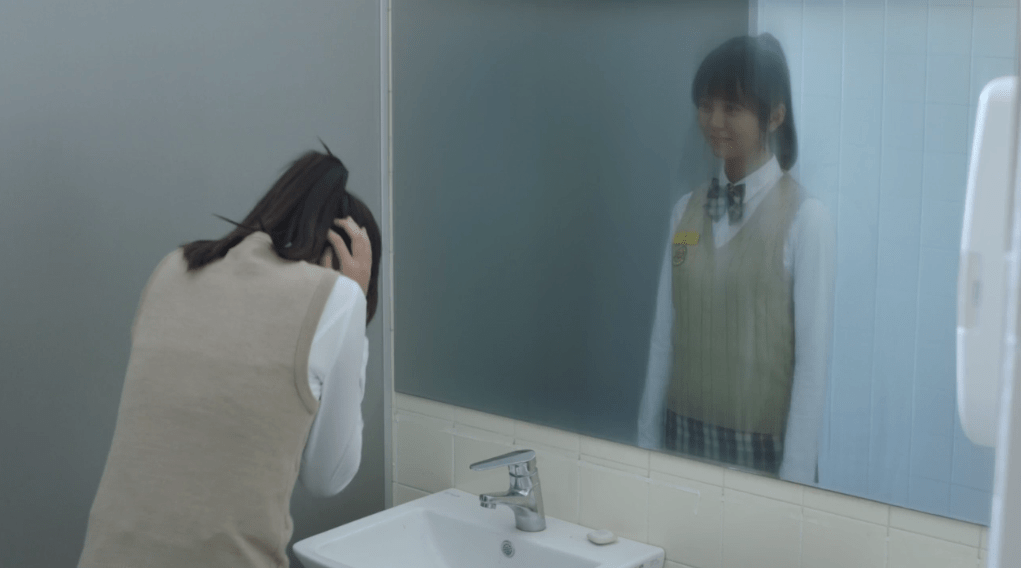 Every scene takes place at the school, either inside or on the grounds outside. Teacher Han’s counseling room is set up to look like a psychiatrist’s office complete with a lounge chair so the student can lie back while being counseled. But the main focus is a gigantic full-length mirror situated right at the bottom of the staircase.