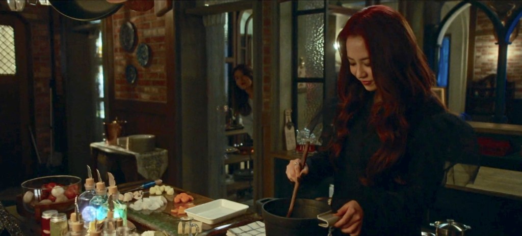 The restaurant, The Witch’s Diner, is quite interesting. There is ever only one customer at a time and the staff – Witch Jo, Jung Jin, and Gil-Yong – is always right at the large table, alongside their customer as the person is eating. A darling little talking tree sits at the restaurant’s bar, and the kitchen can be seen from the dining room. There’s also a basement where all kinds of spices – regular and magical – are kept. The whole place is dimly lit which helps to give the rooms an ominous feel.